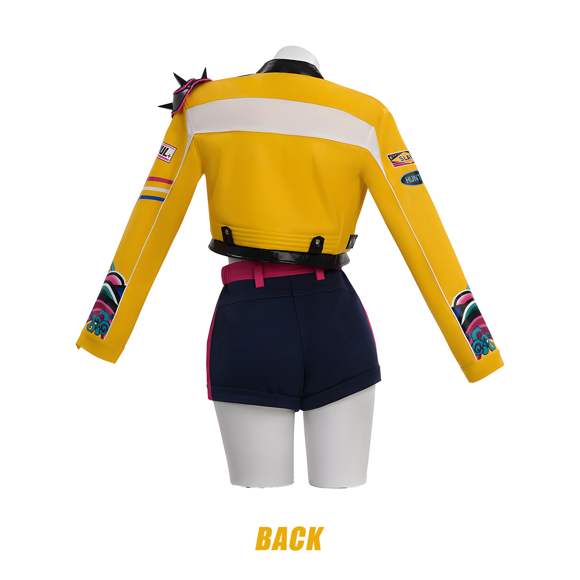 This cosplay suit, created for Rumi, a member of the K-POP virtual idol group Witch Hunters, combines multiple materials and craftsmanship. Twill fabric and mirrored four-way stretch form the main body of the garment, dark blue denim and pitted knitting add layers, and yellow satin brightens the look. Laser technology accurately outlines lines, while embroidery, 3D printing, and heat transfer technologies create exquisite patterns and three-dimensional decoration, fully restoring the essence of the character’s clothing and enabling the cosplayer to display Rumi's unique charm and stage style perfectly.